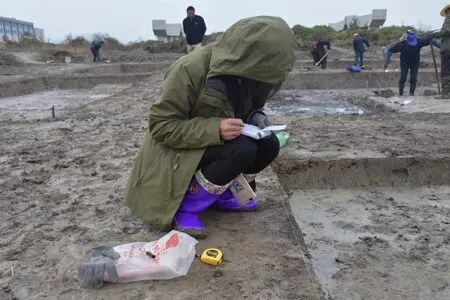 原来一直以为南方的冬天不会太冷,但是在下王渡遗址Ⅱ期项目的发掘过程中,大家经历了宁波地区的强降温和大雪天气。南方的冬天阴冷潮湿,对于来自北方的同学们来说十分难捱,上火、感冒、发烧等症状时有出现,但我们的考古队员并没有因此而懈怠。相比身体上的不适应,最棘手的还是天气条件给田野发掘工作造成的种种难题。连日的雨雪、凛冽的寒风都给发掘工作增添了非常大的困难,每天早上的探方面都是结冰状态,清理遗迹时需要大力挥动手铲,近中午时分探方冰面开始融化,整个探方变得泥泞不堪。临近田野发掘结束、清理至探方内生土层时,由于探方底部地层土质过于黏软,常常因双脚陷进淤泥内拔不出来而扑倒在地,带着满身满脸的泥巴上下工似乎已成为常态。为了抢工期,即使在暴雪天气我们也坚持上工,虽然双脚冻得麻木,双手也失去知觉,但是我们仍然认真的收集、清理陶片,并最大精度的做好每一个遗迹的记录。