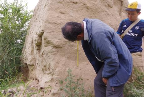魏坚教授在测量城墙夯层厚度
